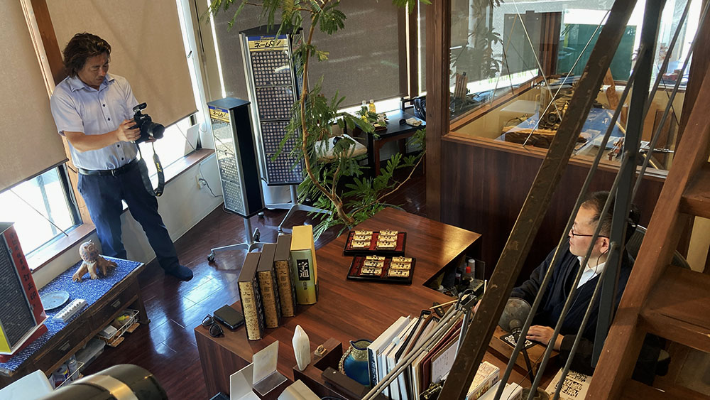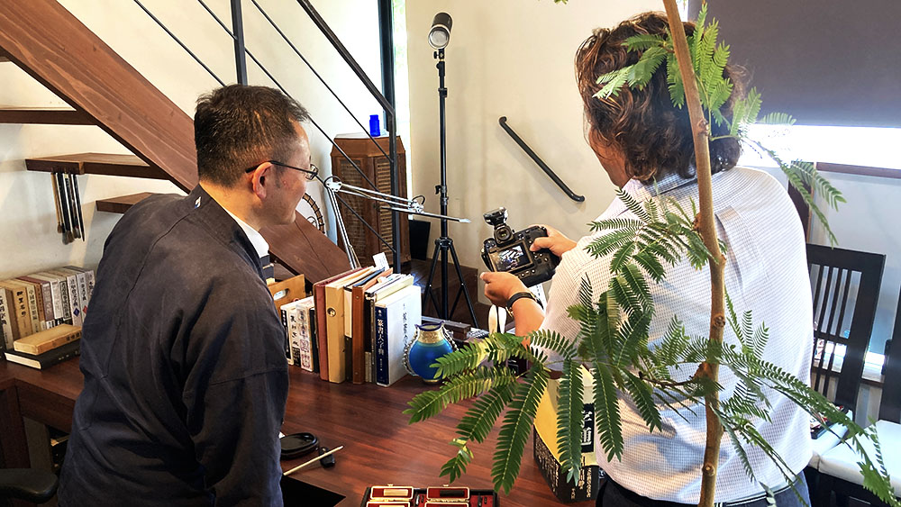 今までブログなどに使う画像として作品や、手元の画像は、結構撮ってますが、プロフィール画像のような全体の画像がないので、江平五差路から宮崎駅に向かう道沿いにある美光スタジオの日髙君に来て貰いました。