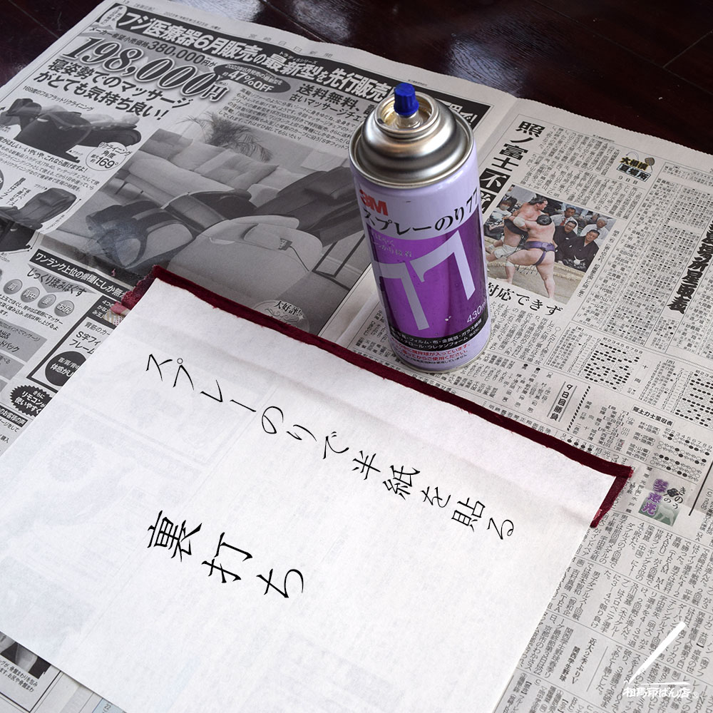 新聞紙を広げてベルベットの裏側にスプレーのりを吹きかけ、そのご半紙を貼り合わせます。