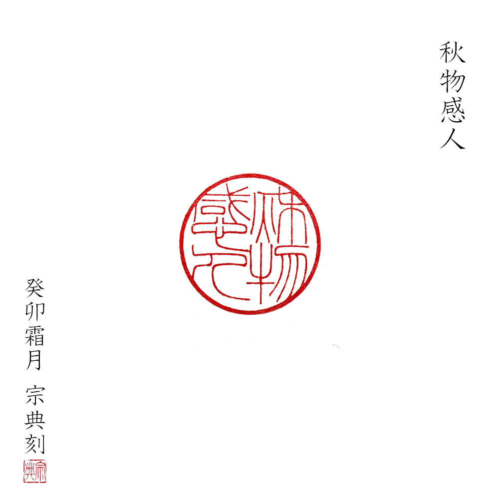 2023.11.19 「秋物感人」を実印のサイズで彫る 印文:秋物感人意味:秋の風物景色は人を感動させる。印材:象牙大きさ:15㎜丸書体:篆書(中輪の細字) ブログランキングに挑戦中です。ポチッポチッと、応援よろしくお願いします(。-人-。) 秋が深まり、九州山地も雪が降ったようです。とは言え、紅葉が遅い宮崎はこれから色づいた景色を楽しめるのではないでしょうか。 今回は、急いで作って4時間ほどで作り上げましたが、さすがに疲れました。21時にInstagramにアップし終え、疲れきって23時には店を出ました。 ≪関連記事≫ 流水不腐を彫る 山下清の実印をつくるとしたら… 将無同を銀行印のサイズに刻す