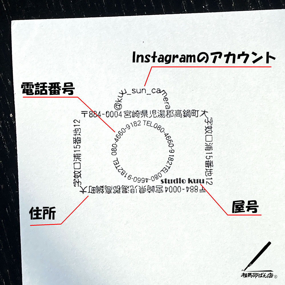 デザインはお任せとなり、その場で面白い形が思いついたので遊び心を入れていいですか?って、尋ねると了承を頂きました。ゴム印の入れる屋号、住所、電話場号は、Instagramのメッセージで送って頂きました。