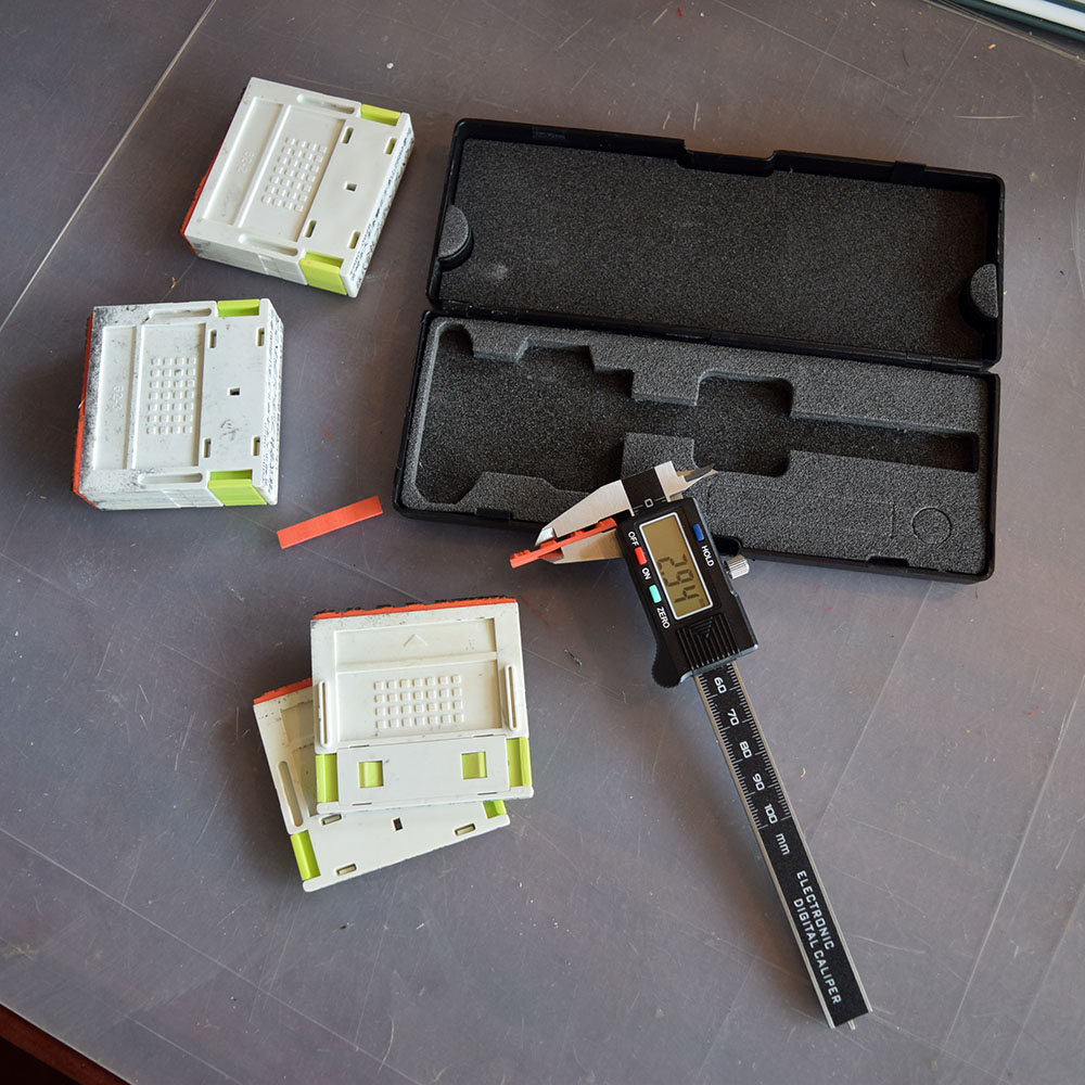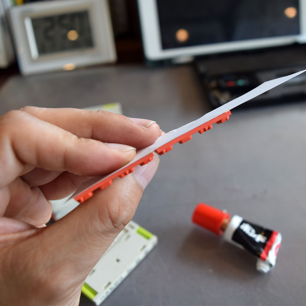 今まで触って指の感触で今まで使ってきたゴムと、新しく作ったゴムの高さの違いみて、低い方にコピー用紙や、ハガキを貼り合わせて付けて高さが合っているか指で触って、合っていなかったら剥がして、もう一枚貼り合わせるという作業をしてました。