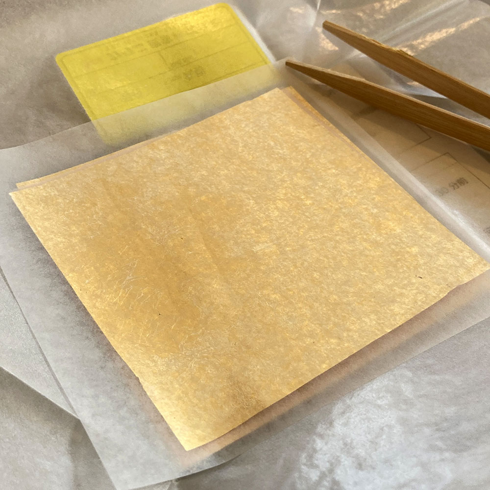 次は、そっと金箔を包んでいる紙を広げましたが、見事に1/4ほどクシャクシャになりました…orz クシャクシャになった金箔の端を竹箸で掴んでゆっくり引っ張って広げました。