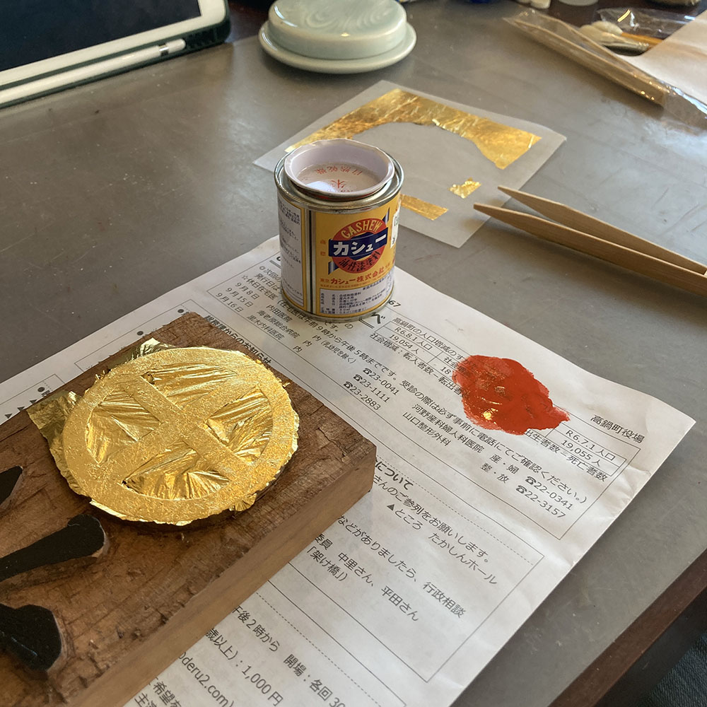 通常は、金箔を短冊状に切ってから少しづつ貼っていきますが、今回は円形で面倒なのでロスがでますが切らずに一枚をのせて一発で貼り終えました。
