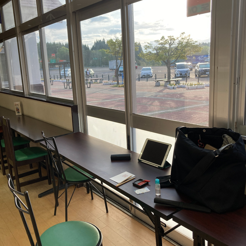 朝5時に起床してサービスエリアの窓際のカウンターで印稿を書き上げ、ブログ投稿を終え7時に出発。